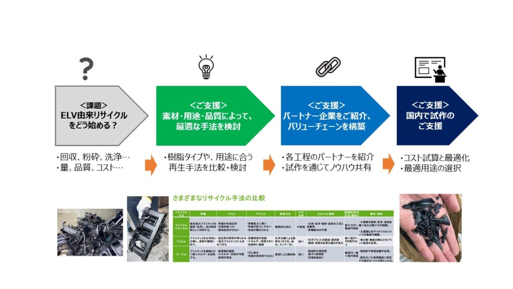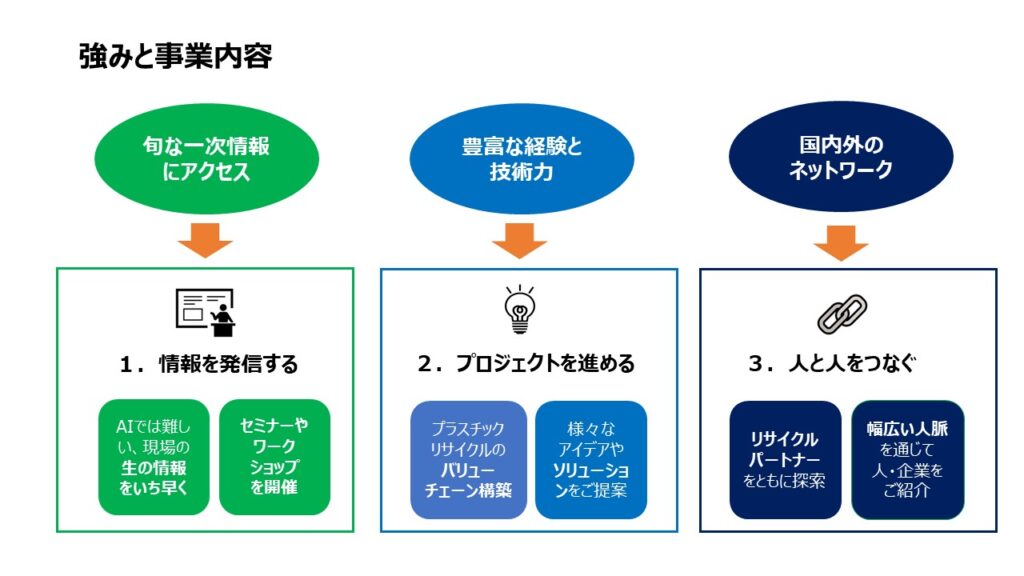 リサイクルを推進するには、さまざまな役割をもつ複数の企業との協業が不可欠です。20年以上のプラスチックリサイクル経験から、バリューチェーン構築から技術面まで、幅広くご支援いたします。
